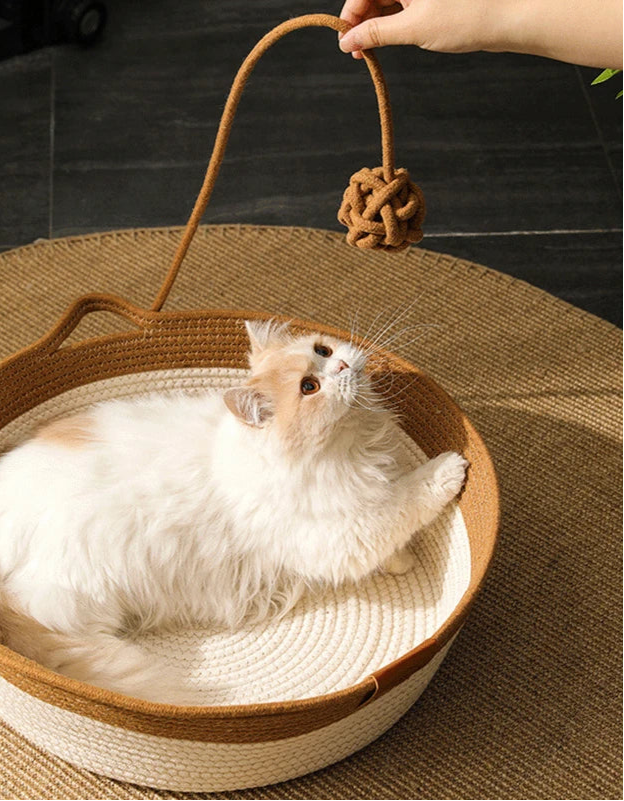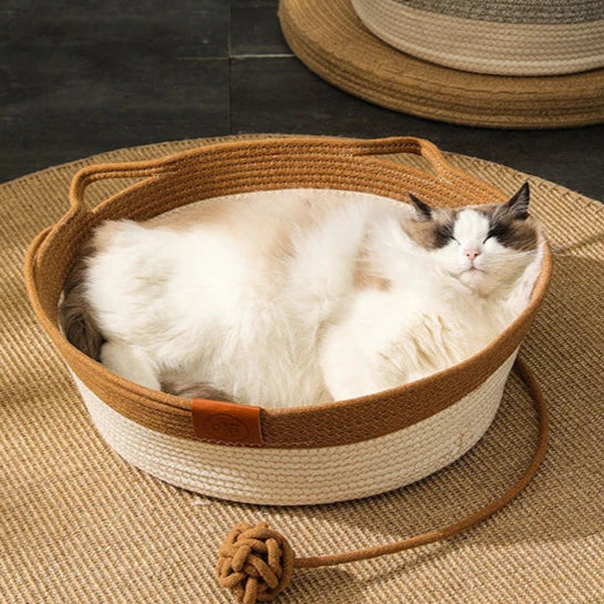 A premium handcrafted rattan nest that combines durability with comfort. The natural cattail grass weave is breathable and scratch-friendly, while the soft removable cushion keeps pets warm and cosy all year round. Elegant, sustainable, and easy to clean — the perfect hideaway for your feline friend.